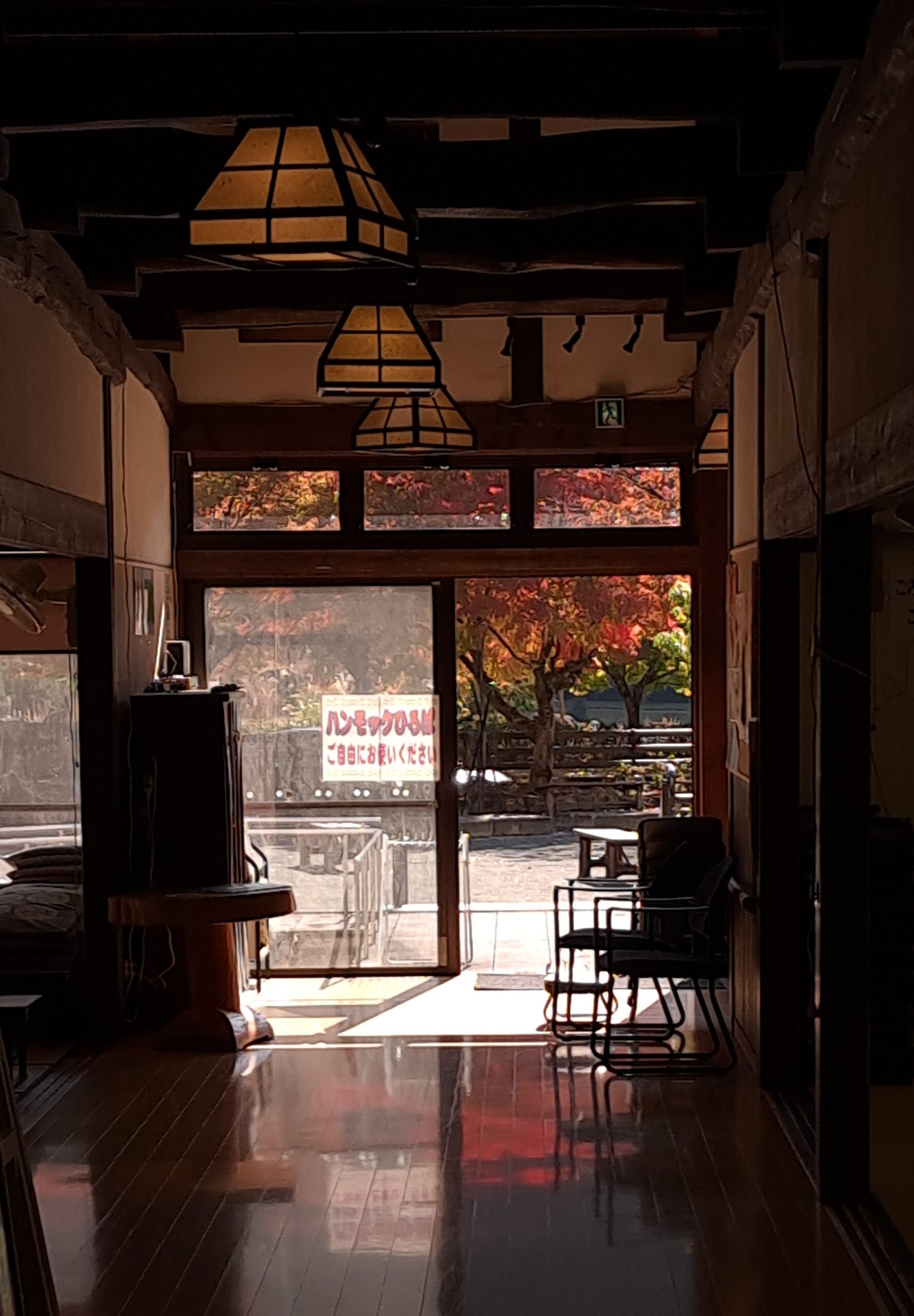 休憩室の真ん中を通っています廊下に庭のモミジが綺麗に映ります