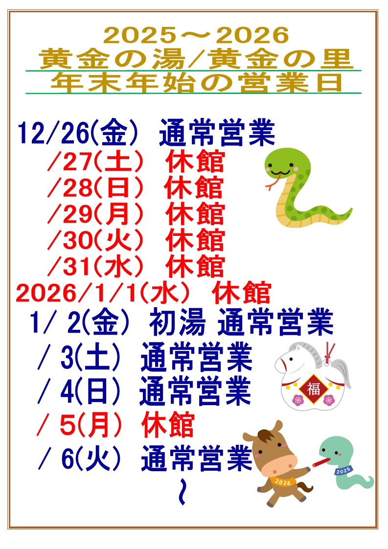 黄金の湯/黄金の里の年末年始の営業日のお知らせです