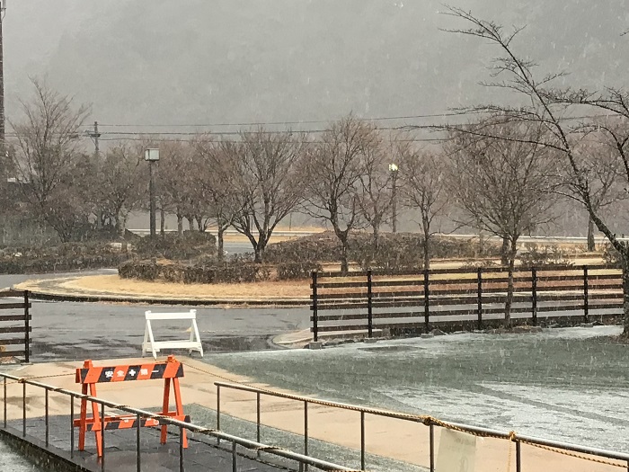 黄金の湯付近、朝9時ごろから雪が降り始めてきました
